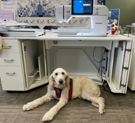 You may not have met Holly. She's Ross's dog and usually stays in the workshop with Ross. She's a beautiful, loving Golden Doodle. We have restocked our Isacord (embroidery thread) inventory and OESD stablilizers so it's a good time to find what you need.