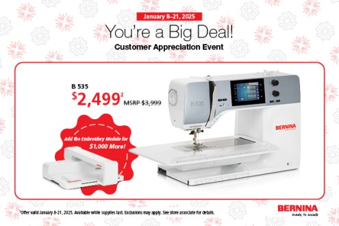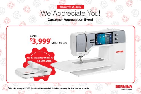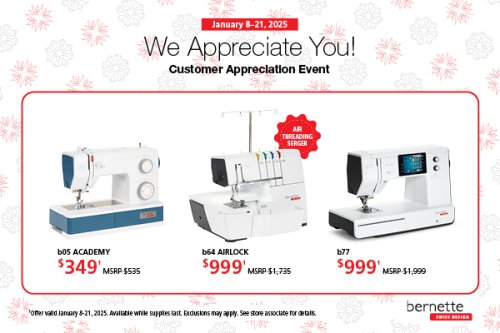 TUESDAY: Jan 14, 9:30-Noon: Caring Hearts WEDNESDAY: Jan 15, 1:00-4:00: Wool Applique Club (Cost: $5) THURSDAY: Jan 16, Noon-5:00: Sit 'N Sew. (Cost: $5) FRIDAY: Jan 17, 1:00-4:00: Embroidery Club. Please go to https://mysewfab.com/module/class/403786/sew-fab-embroidery-club-adventure to read more about this month's project and to sign up. If you have any questions, please call us at 269-459-1725. SATURDAY: Jan 18, 9:30-11:30: Beyond Bernette Basics. This class is sold out but we have another on February 10; go to https://mysewfab.com/module/class/559782/beyond-bernette-basics for more details and to sign up. SATURDAY: Jan 18, 12:30-4:00: Beyond Bernette Embroidery Basics. This class is also sold out. The next opportunity is February 8, 12:30-4:00. Please go to https://mysewfab.com/module/class/578409/beyond-bernette-embroidery-basics to read all about and sign up.