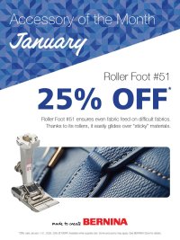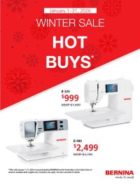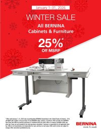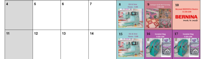 THUR 1/8, 12:00-5:00: Sit & Sew FRI 1/9, 2:00-4:00: Antique Quilt Bed Turning Sat 1/10,11:30-4:00: Beyond BERNINA Basics