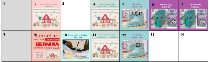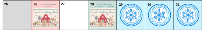 MON 1/26 5:30-6:30 Farm Fresh Sew Along Video Viewing WED 1/28, 9:30-12:00 Farm Fresh Sew Along Morning Sew-In 1:00-4:00 Snap Dragons (Private Group) 4:00-6:30 Farm Fresh Sew Along Afternoon Sew-In THUR-SAT, 9:00-6:00 In House Retreat